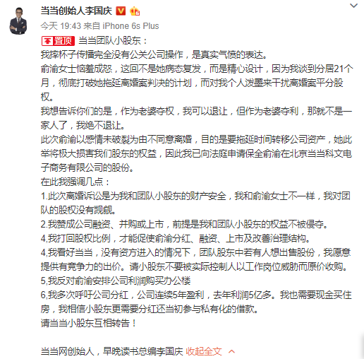 他還強調,此次離婚訴訟是為自己和團隊小股東的財產安全,他與俞渝不同,對團隊的股權沒有覬覦;贊成公司融資、并購或上市,前提是自己和團隊小股東的權益不被侵奪;自己打回股權比例,才能促使俞渝分紅、融資、上市及改善治理結構;看好當當,沒有資方進入的情況下,團隊股東中若有人想出售股份,自己愿意提供有競爭力的出價。請小股東不要被實際控制人以工作崗位威脅而原價收購;反對俞渝安排公司利潤購買辦公樓;多次呼吁公司分紅,公司連續5年盈利,去年利潤5億多。自己也需要現金買住房,小股東更需要分紅還當初參與私有化的借款。