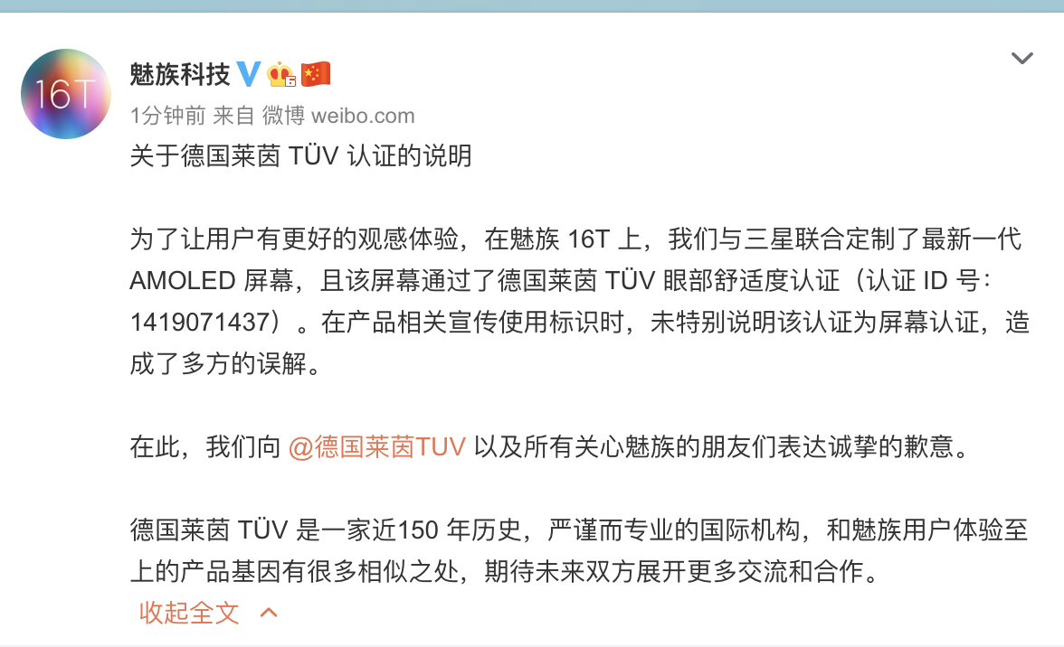 速途網10月25日消息(報道:喬志斌)今日,魅族通過官方微博回應稱,在魅族16T上,我們與三星聯合定制了最新一代AMOLED屏幕,且該屏幕通過了德國萊茵TUV眼部舒適度認證。在產品相關宣傳使用標識時,未特別說明該認證為屏幕認證,造成了多方的誤解。