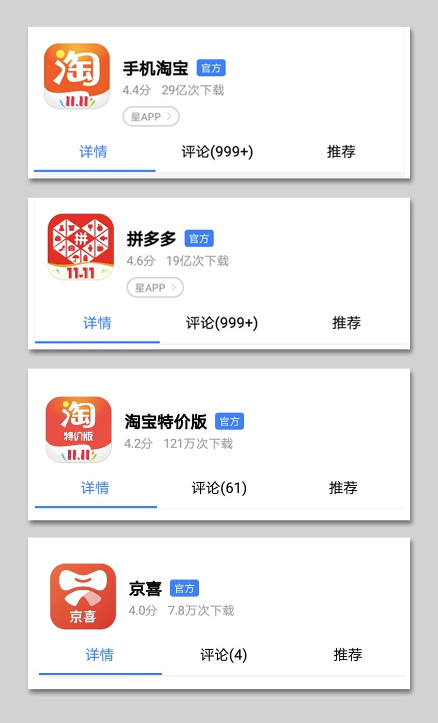 在中國各大第三方安卓商城中,購物類應(yīng)用下載量維持高速增長。騰訊應(yīng)用寶的數(shù)據(jù)顯示,截至目前,手機(jī)淘寶的總下載量已達(dá)29億次,上線僅4年的拼多多,下載量急速攀升至19億次。阿里巴巴和京東針對(duì)下沉市場推出的“淘寶特價(jià)版”和“京喜”,下載量分別為121萬次和7.8萬次。