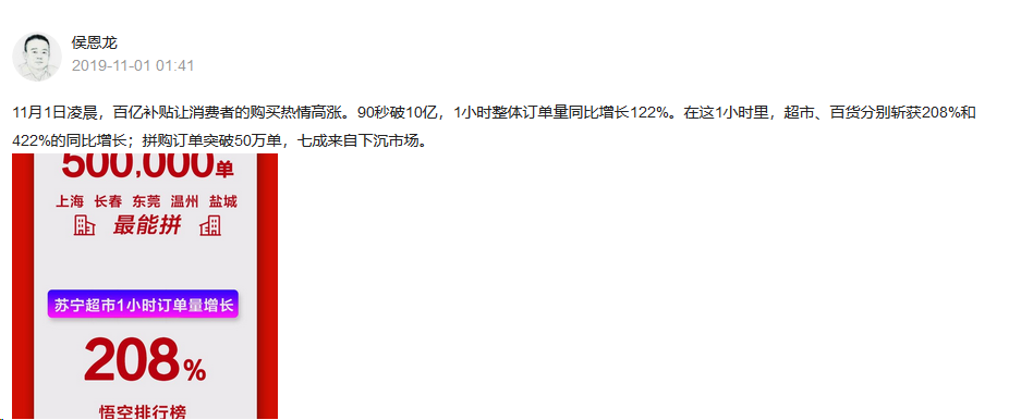速途網11月1日消息(報道:李楠)今天凌晨,蘇寧易購總裁侯恩龍更新微頭條,公布 “雙十一全民嘉年華”1小時戰報。數據顯示:今年雙十一消費者“買買買”的熱情高漲,1分30秒時已破10億,一小時整體訂單量同比增長122%。
