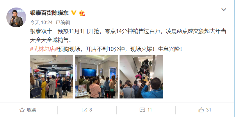 速途網11月11日消息(報道:李楠)今天上午,銀泰商業CEO陳曉東在微博上發出戰報:11月1日零點雙11開場,14分鐘銷售過百萬,凌晨兩點線上成交額超去年全天。據悉,今天12:38分,線上銷售超去年雙11全天。