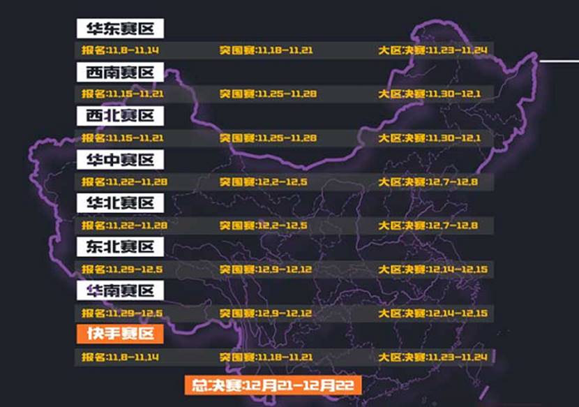 本次“PUBG全民大師賽”分設華東、華北、華中、華南、東北、西南、西北和快手專區八大賽區,包含雙排和四排隊伍兩大賽事模式。每個賽區的選手需要經歷報名海選賽、大區突圍賽、大區決賽、總決賽四個賽段才能最終登上“逐鹿群雄”的“吃雞”職業賽場之路。