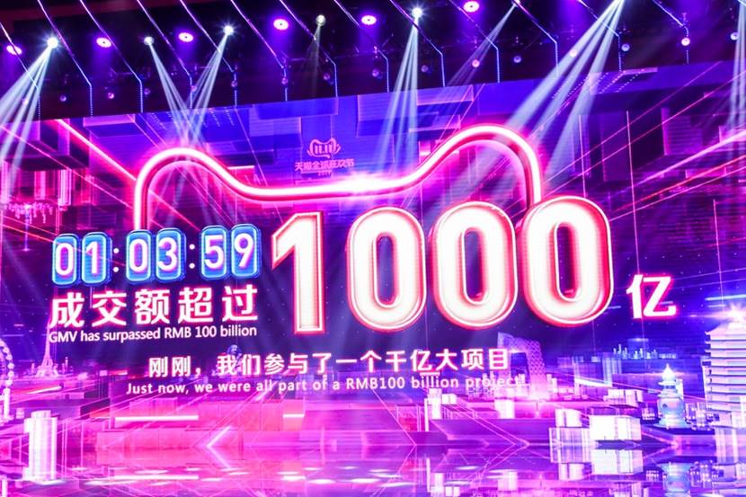 速途網11月11日消息(報道:李楠)今日1點03分59秒,天貓雙11成交總額沖破1000億大關,比2018年快了43分鐘27秒,比2017年快了將近8小時。