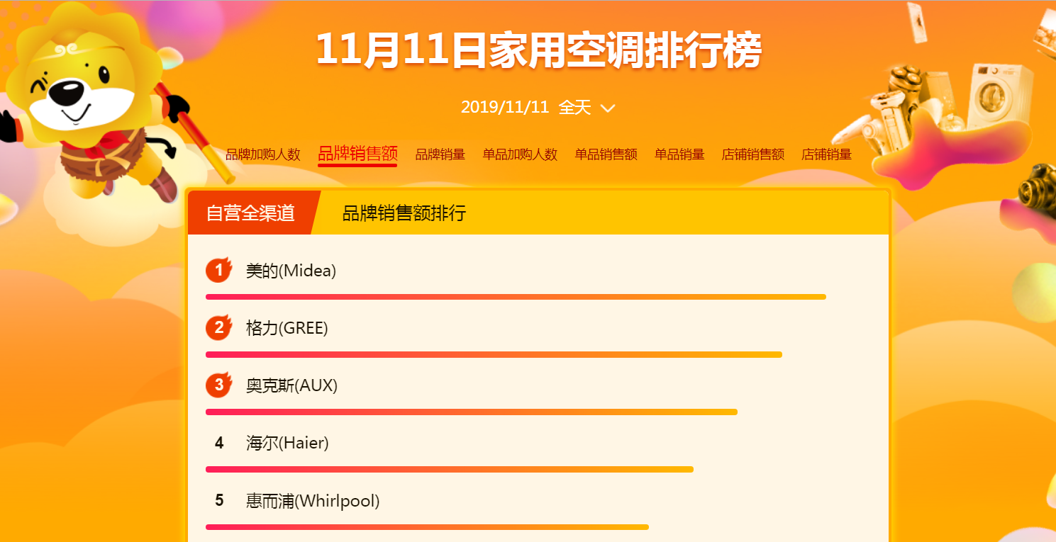 雙十一期間,蘇寧生活家電線上訂單量同比增長79%,電視線上訂單量同比增長68%,冰箱洗衣機線上訂單量同比增長77.2%,空調線上訂單同比增長120%。其中,悟空榜實時數據顯示,11月11日當天,家用空調品牌銷售額排行榜上,美的奪冠,格力、奧克斯分列二三位。
