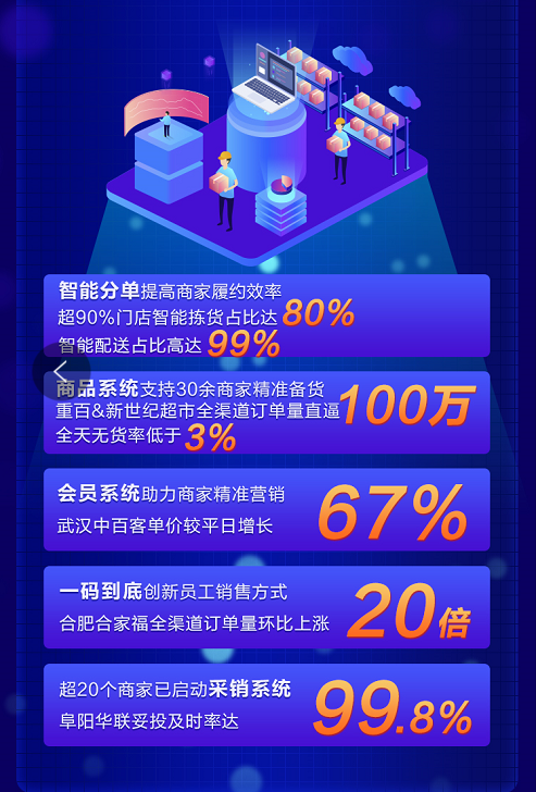 多點Dmall戰報顯示,目前多家門店已整體切換Dmall OS,手機工作臺實現北京物美80000員工全面在線,全渠道訂單量可比上漲50%;智能購成60+商家標配,新百連超智能購訂單占比達60%;智能分單提高商家履約效率,超90%門店智能揀貨占比達80%、智能配送占比高達99%;商品系統支持30余商家精準備貨,重百&新世紀超市全渠道訂單量直逼100萬,全天無貨率低于3%;會員系統助力商家精準營銷,武漢中百客單價較平日增長67%。