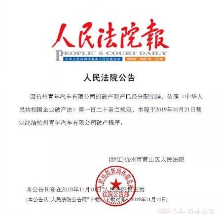 速途網11月18日消息(報道:喬志斌)近日,人民法院公告,因青年汽車的破產財產已經分配完結,依照《中華人民共和國企業破產法》第一百二十條之規定,已于2019年10月21日裁定終結青年汽車破產程序。