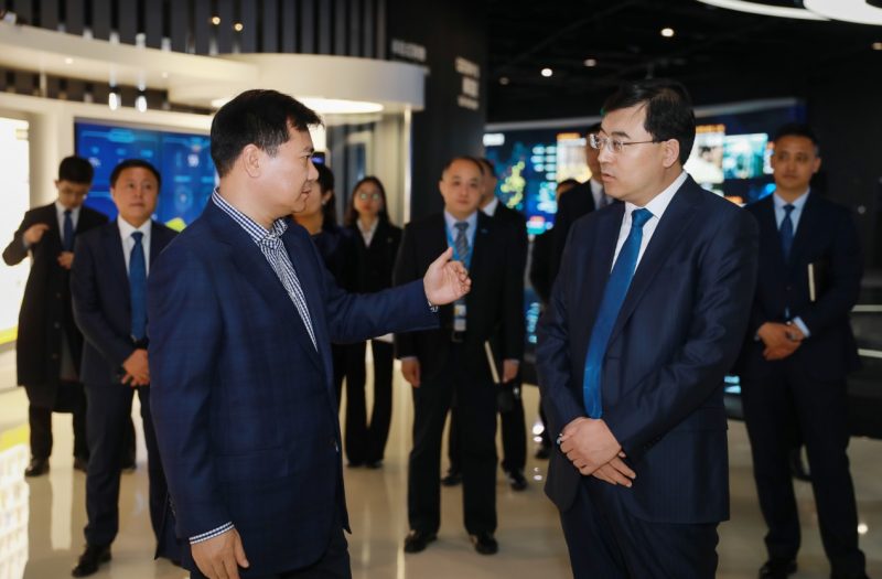 (圖:蘇寧控股集團董事長張近東與伊利集團董事長潘剛就企業發展情況進行交流)