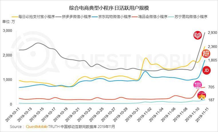 報告顯示,今年大促期間,各大主流電商平臺的小程序DAU同樣大幅上升,拼多多微信小程序、每日必搶支付寶小程序和京東購物微信小程序分列綜合電商雙11當天小程序DAU前三位,DAU分別是2930萬、2360萬和1805萬。
