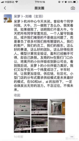 11月28日,一張來(lái)自呆蘿卜合伙人劉峰的朋友圈截圖,在社交網(wǎng)絡(luò)上廣泛流傳。截圖顯示,呆蘿卜杭州中心關(guān)閉,劉峰在妥善安置所有員工后,留守到了最后。他同時(shí)感嘆,辜負(fù)了很多人的希望,在盈利觸手可得之時(shí),卻自己跌倒。