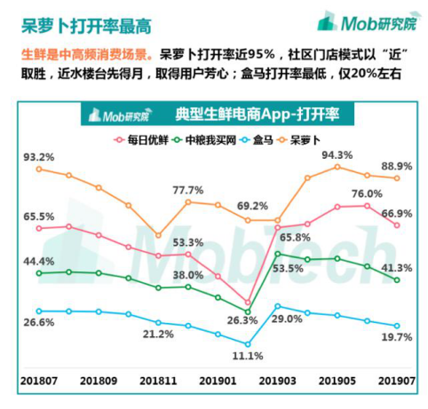 資本青睞、門(mén)店數(shù)量持續(xù)更新,呆蘿卜甚至榮獲“2019二季度胡潤(rùn)中國(guó)潛力獨(dú)角獸”的稱(chēng)號(hào)。而憑借著平價(jià)策略,呆蘿卜也深入人心。來(lái)自Mob研究院第三方報(bào)告顯示,呆蘿卜一度曾以95%的APP打開(kāi)率,以及60%的次月留存率,打敗盒馬和每日優(yōu)鮮,領(lǐng)跑行業(yè)。