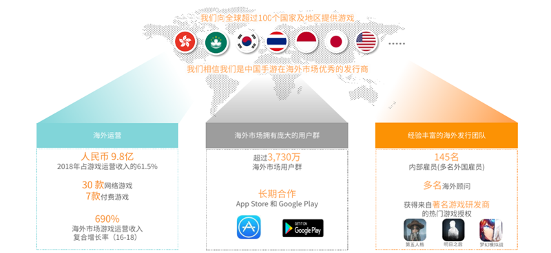 心動(dòng)作為中國(guó)游戲運(yùn)營(yíng)商中打入海外市場(chǎng)的先行者,旗下?lián)碛?0款網(wǎng)絡(luò)游戲及7款付費(fèi)游戲于海外市場(chǎng)推出,于超過(guò)100個(gè)國(guó)家及地區(qū)包括中國(guó)香港、中國(guó)澳門(mén)、中國(guó)臺(tái)灣、日本、韓國(guó)、東南亞、北美洲、南美洲及澳大利亞等市場(chǎng)分發(fā),海外巿場(chǎng)收入占游戲營(yíng)運(yùn)總收入由2016年2.1%飆升至2018年的61.5%,至2019年5月31日止五個(gè)月更升至接近七成,海外用戶(hù)群數(shù)量超過(guò)3,730萬(wàn)。公司擁有由145位經(jīng)驗(yàn)豐富雇員(擁有多名外國(guó)雇員)組成的海外發(fā)行團(tuán)隊(duì),成功以一站式服務(wù)協(xié)助中國(guó)游戲開(kāi)發(fā)商有效進(jìn)入國(guó)際市場(chǎng),發(fā)行及運(yùn)營(yíng)能力昭著,獲得來(lái)自著名游戲研發(fā)商的熱門(mén)游戲授權(quán)(如網(wǎng)易《第五人格》、網(wǎng)易《明日之后》等熱門(mén)游戲)。