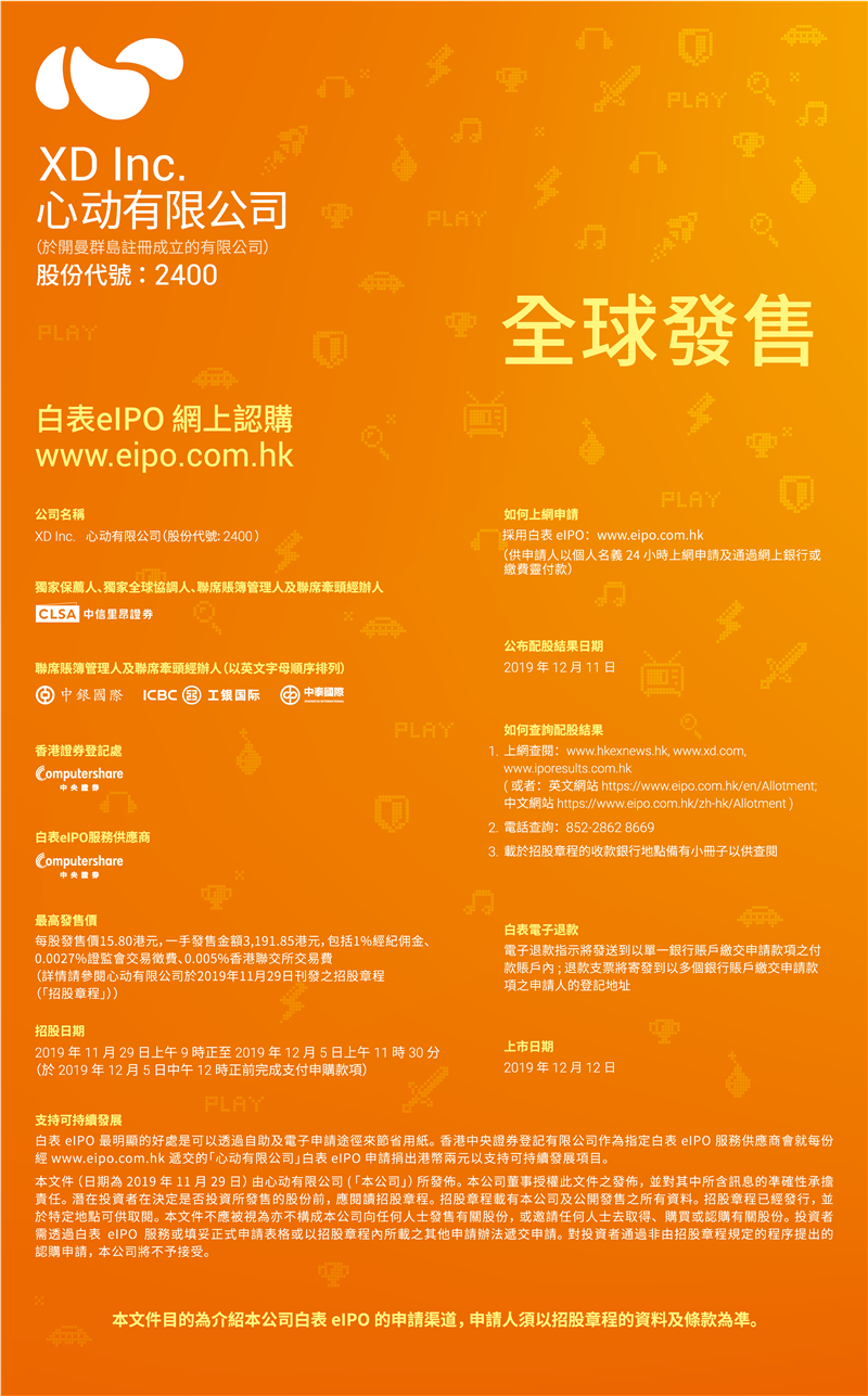 心動(dòng)有限公司正式公布香港聯(lián)交所主板上市的計(jì)劃。將于2019年11月29日在全球公開(kāi)發(fā)售,并預(yù)計(jì)于2019年12月12日在港交所正式掛牌交易,其股份代號(hào)為2400。