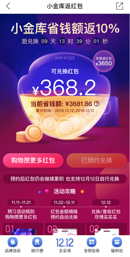 同時,雙12期間喵街上線了一款名為“小金庫”的產品,會員可以清晰的看到自己的年度消費賬單、省錢賬單,這一年在銀泰省的錢還可以在雙12當天按照10%的比例當錢花。繼商品、導購、商場在線化之后,銀泰在消費交易環節的在線化上也取得了重大突破。