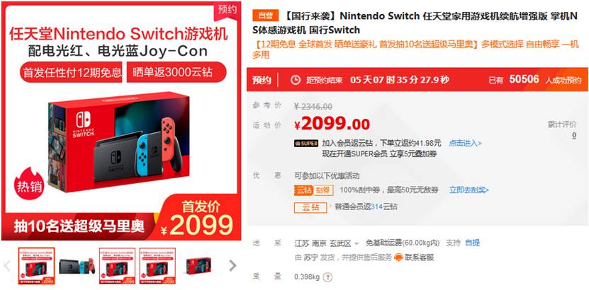 12月4日,國行任天堂Switch正式發布,國行版NintendoSwitch為續航增強版,官方售價2099元,目前已在蘇寧易購上線預約,將于12月10日在蘇寧易購線上線下雙線渠道正式開售,獨家提供12期分期免息,截至4日發布當天下午16點,已有超過5萬人涌入蘇寧搶先預約。