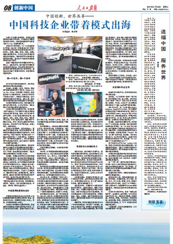 11月26日,《人民日報》海外版以《中國科技企業帶著模式出海》為題,用整版的篇幅報道了利用創新模式出海的中國科技企業典范。這其中包括在倫敦開設研究所的華為,風靡世界的短視頻應用TikTok,引領亞洲支付的螞蟻金服,與馬來西亞建立“城市大腦”的阿里云,以及把中國模式成功復制海外的代表赤子城。