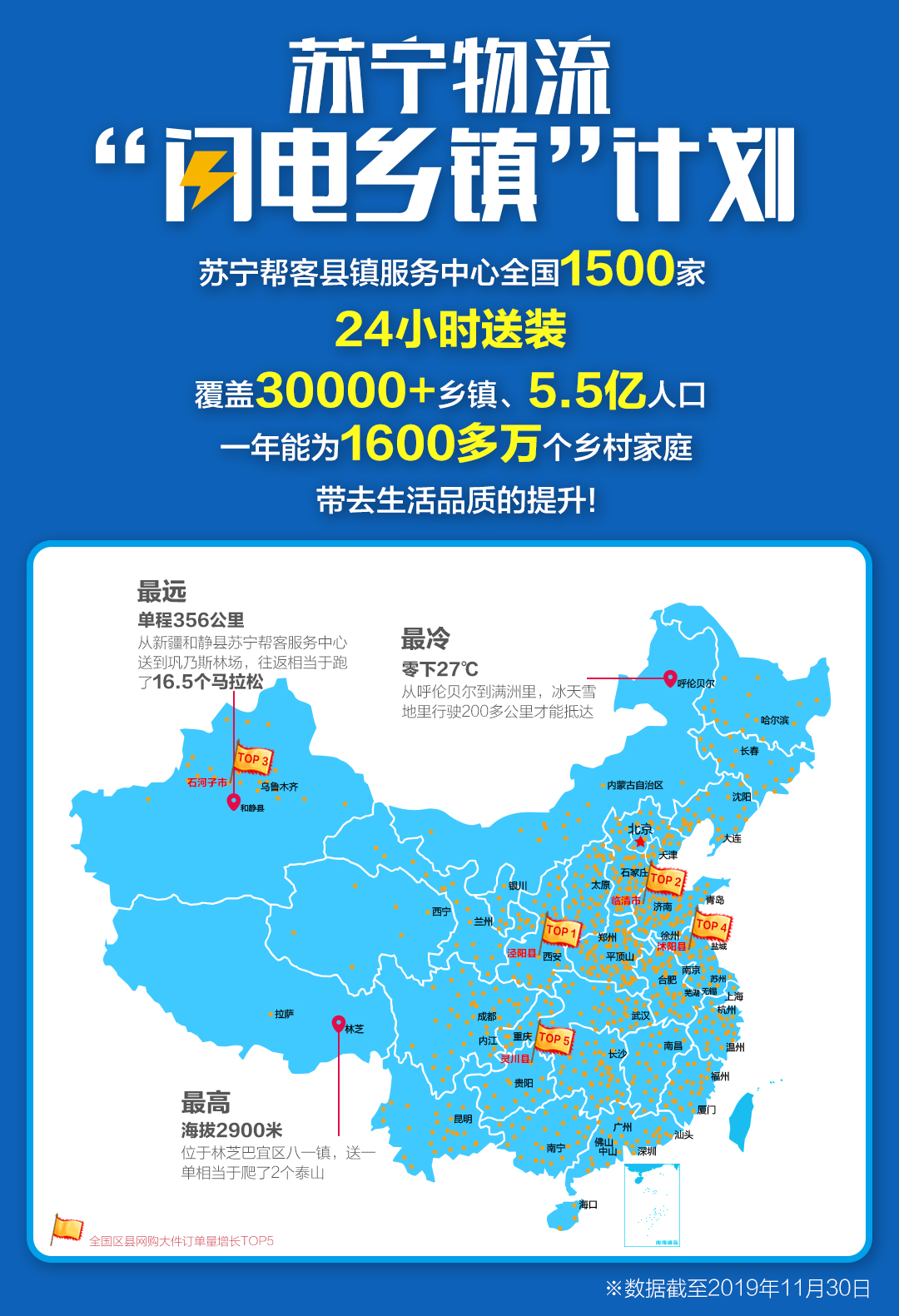 據了解,自2018年,蘇寧物流針對四至六線下沉市場,以蘇寧幫客縣鎮服務中心為基點,開始打造鄉鎮近場服務網絡。2019年10月,蘇寧物流正式發布了“閃電鄉鎮”計劃,為全國超30000鄉鎮提供“24小時送裝”服務。