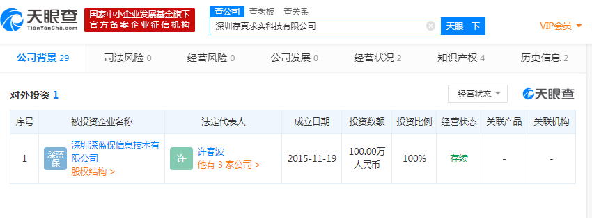 速途網(wǎng)訊 天眼查數(shù)據(jù)顯示,12月22日,小米科技的投資實體之一天津金米投資合伙企業(yè)(有限合伙)新增對外投資,被投資方為深圳存真求實科技有限公司,即“深藍(lán)保”的運(yùn)營主體。深圳存真求實科技有限公司經(jīng)營范圍包括電子商務(wù)技術(shù)研發(fā)、電子商務(wù)平臺運(yùn)營;信息安全技術(shù)研發(fā)服務(wù);數(shù)據(jù)挖掘、數(shù)據(jù)分析、數(shù)據(jù)服務(wù)及數(shù)字化資源開發(fā)等。