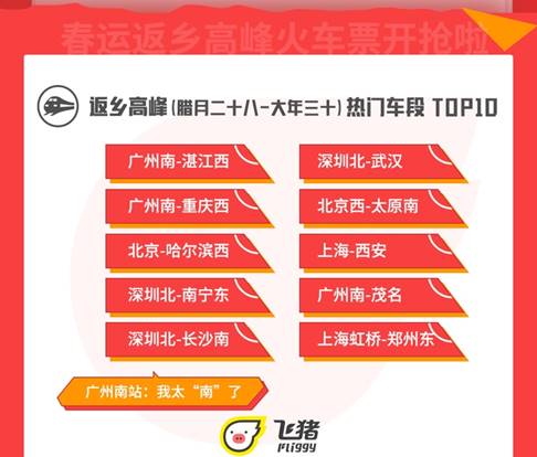 速途網12月24日消息(報道:李楠)今日,農歷臘月二十八(1月22日)的火車票開售,返鄉高峰的“搶票大戰”迎來關鍵時刻。由于工作繁忙、請假不便等因素,大部分上班族會在過年前幾天踏上返鄉旅程。飛豬火車票購票及預約數據顯示,返鄉高峰的TOP10熱門車段,始發站被北京、上海、廣州、深圳四城占據。返鄉高峰期間,廣州南站和白云機場的購票量均為最高,廣州將成為2020年春運大樞紐,而從廣州出發返鄉數量最多的,是飲食差異最大的重慶人。