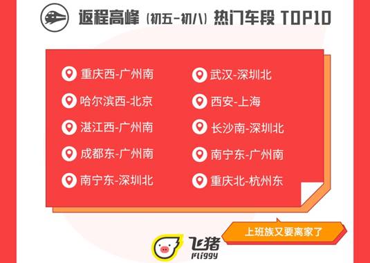 另外,根據飛豬平臺火車票預約情況,春運回程高峰將出現在大年初五至初八,選擇初六返程的人最多。春運回程高峰期間,熱門車段TOP10的到達站同樣被北、上、廣、深四城“包場”,其中廣州南站獨占4席。看來,漂在北上廣深的人最晚回家,經短暫的團圓后,又最早離家。