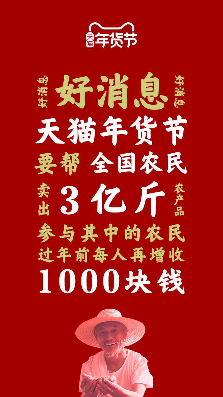淘寶天貓今日宣布:天貓年貨節將于臘八節(1月2日)正式啟動,目標只有一個:幫全國農民賣出3億斤農產品,讓每位參與其中的農民過年前再增收1000塊錢,讓農民過個好年。