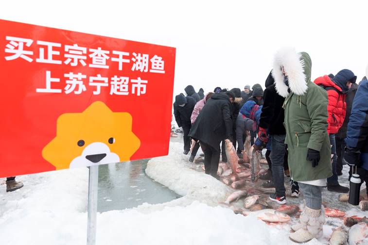 12月28日,祭湖、醒網(wǎng)儀式過后,查干湖第十八屆冰雪漁獵文化旅游節(jié)開幕冬捕第一網(wǎng)鮮魚出水。當(dāng)?shù)亓阆?5℃甚至更低的氣溫,成為天然冷庫,第一時間速凍鎖住胖頭魚的新鮮。蘇寧超市同步上線銷售查干湖胖頭魚,讓消費者的餐桌上年年有魚。