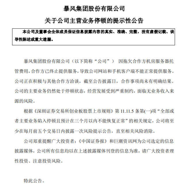 速途網訊 昨日,暴風集團發布公告稱,因拖欠合作方機房服務器托管費用,合作方已終止提供服務,導致公司網站和手機客戶端不能正常提供服務。公司正在積極與其他合作方洽談,截至公告披露日,合作事項尚未有明確結果。公司的主要業務仍然處于停頓狀態,經營發展受到嚴重制約,面臨無業務收入來源的風險。
