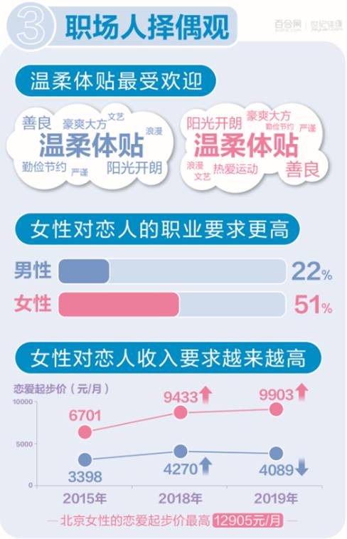 戀人收入決定了戀愛起步價,對戀人收入的要求,男性與女性各有不同。女性一年更比一年高,2019年已升高至9903元/月;男性心中的戀愛起步價則在上漲中略有波動,2019年為4089/月;分收入看,收入越高,設下的戀愛門檻也越高,收入20000以上的女性心中平均戀愛起步價為16658元/月;分地區看,北京女性戀愛起步價為12905元/月,排名第一;分學歷看,學歷越高,戀愛起步價越高,大學本科學歷的單身,男女戀愛起步價相差最大。