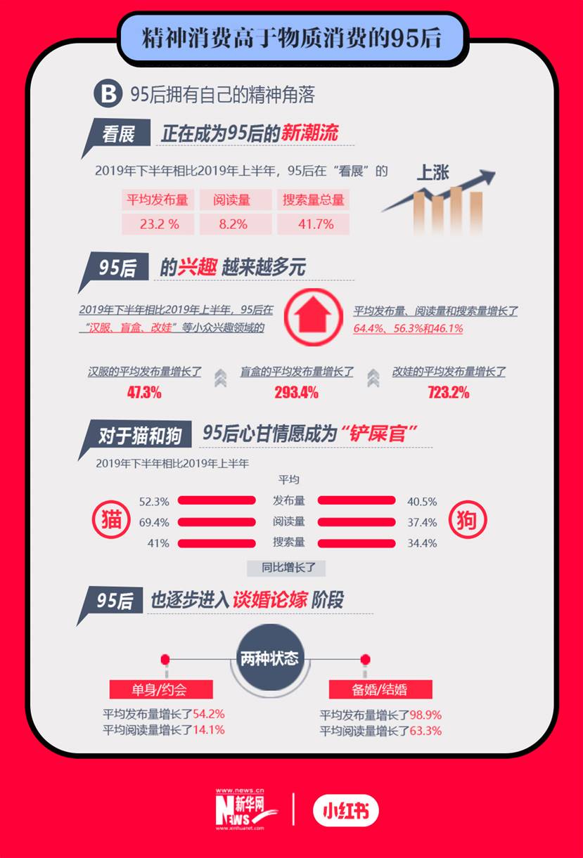 在精神消費層面,過去半年,小紅書上“看展”的搜索量增長環比超過40%,平均發布量超過20%,“看展”也正在成為95后的新潮流之一。