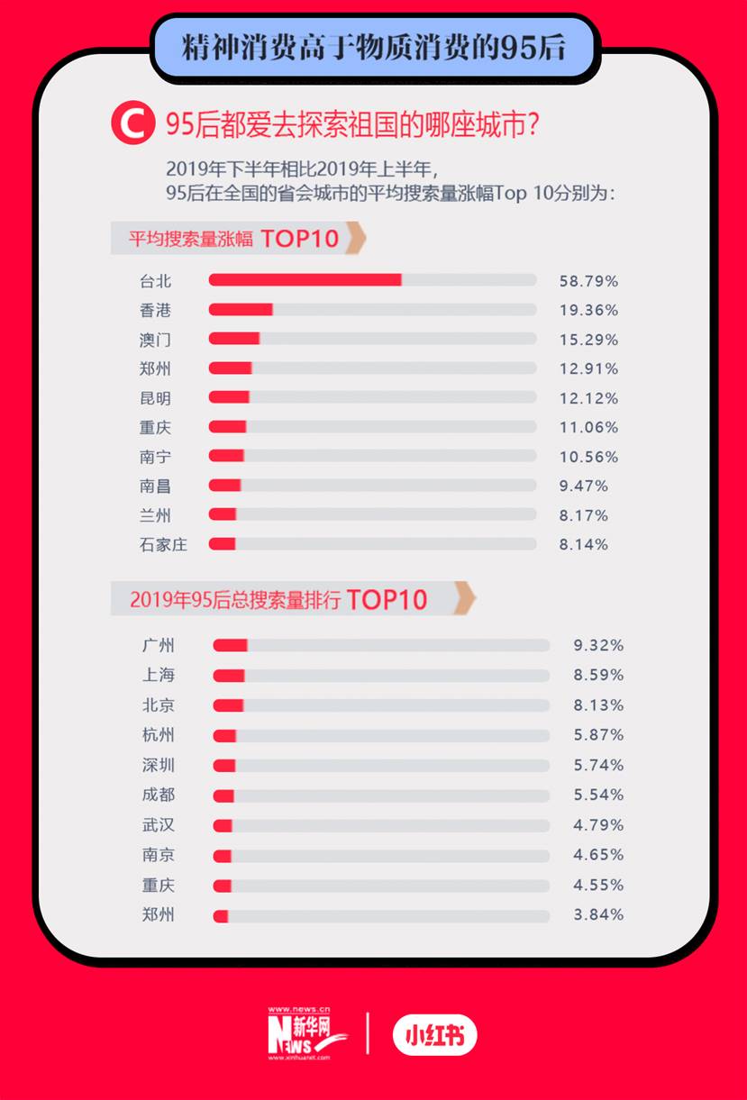 此外,報告還顯示了95后對于城市的關注度,廣州、上海、北京、杭州和深圳成為2019年搜索量TOP5。在平均搜索量漲幅上,臺北、香港、澳門、鄭州、昆明成為漲幅TOP5。