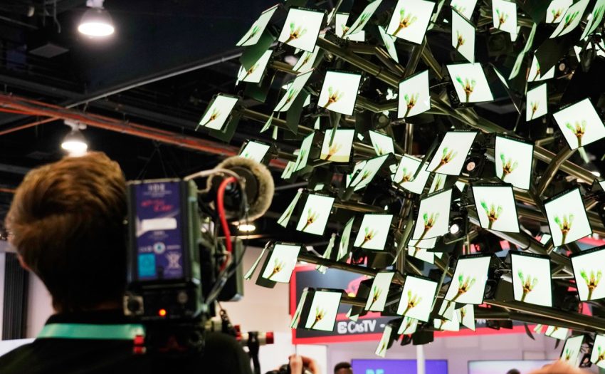 圖:柔宇全球首棵柔性屏科技樹“柔樹”吸引媒體報道及觀眾體驗