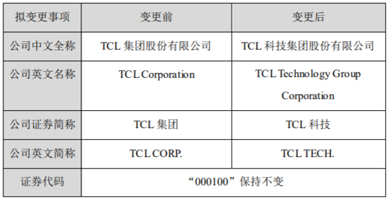 速途網(wǎng)訊 今日,TCL集團(tuán)發(fā)布公告,擬將名稱變更為“TCL科技集團(tuán)股份有限公司”,英文名稱相應(yīng)變更為“TCL Technology Group Corporation”,將證券簡稱變更為“TCL科技”,英文簡稱變更為“TCL TECH.”,證券代碼仍為“000100”。