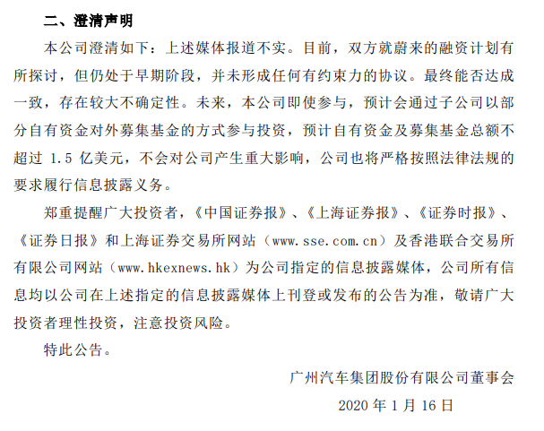 速途網訊 廣汽集團發布澄清公告:“廣汽集團計劃入股投資蔚來汽車10億美元”的媒體報道不實,目前雙方就蔚來的融資計劃有所探討,但仍處于早期階段,并未形成任何有約束力的協議。廣汽集團稱,未來,本公司即使參與,預計會通過子公司以部分自有資金對外募集基金的方式參與投資,預計自有資金及募集基金總額不超過1.5億美元,不會對公司產生重大影響 。