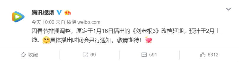騰訊視頻:《劉老根3》改檔延期,預計2月上線 仙雯 ? 2020年1月16日 16:36 ? 大文娛, 快訊 速途網(wǎng)訊 今日,騰訊視頻發(fā)表微博稱,因春節(jié)排播調(diào)整,原定于1月16日播出的《劉老根3》改檔延期,預計于2月上線。具體播出時間會另行通知,敬請期待! 贊 (0) 仙雯 0 生成海報 拼多多年貨節(jié):訂單同比增260%,百億補貼激發(fā)城鄉(xiāng)消費強對流 上一篇 2020年1月16日 16:29 支付寶“集五福”數(shù)據(jù):兩天內(nèi)3億人來掃福 下一篇 2020年1月16日 17:03