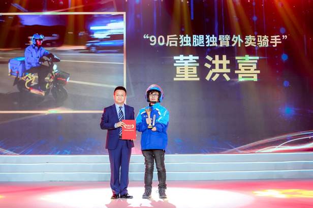 1月16日,新華社授予餓了么騎士董洪喜“中國網(wǎng)事·感動2019”十大人物獎。8歲時的一場觸電事故,奪去了董洪喜的左手和右小腿,如今他靠送外賣養(yǎng)活自己。每天走2萬步,送30多單,讓家人也過上了更好的生活。新華社點(diǎn)贊他:“靠自己的樣子真帥!”