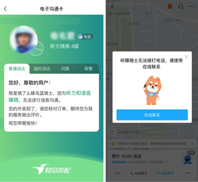 為了更好地輔助殘障騎士工作,餓了么蜂鳥即配在騎手APP上線定制功能,方便有聽力障礙的騎士與用戶、商戶進(jìn)行溝通。