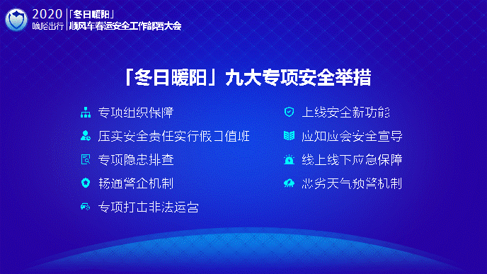 春運出行,安全第一,嘀嗒出行于2019年12月24日正式啟動「冬日暖陽」順風(fēng)車春運安全專項行動計劃,聯(lián)合中國交通頻道在10省交管的聯(lián)合指導(dǎo)下,部署九大安全舉措,包括上線安全新功能,打擊非法營運,加強用戶安全宣導(dǎo)等,公司上下嚴(yán)陣以待,全方位守護用戶的安全,安心地返鄉(xiāng)和返程。