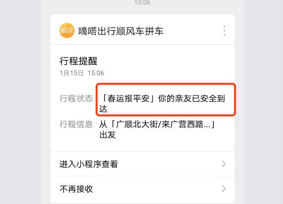 據(jù)了解,此次“春運報平安”功能,是嘀嗒出行“行程分享”功能的全新升級版。用戶在搭乘順風(fēng)車并上車后,可通過微信和短信兩種方式,將行程分享給親友。此時,用戶的親友通過微信點開行程分享小程序,或通過短信點擊鏈接登錄,即可查看用戶的實時行程的信息,不僅可以查看車輛的實時位置,車輛的行駛路線,還可獲悉用戶的預(yù)計到達時間。此外,當(dāng)用戶確認(rèn)到達目的地后,行程分享小程序還會自動通過微信推送消息來通知親友。