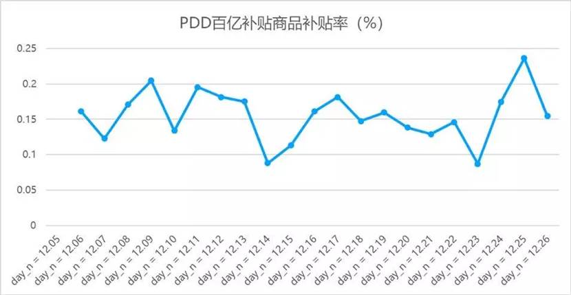 該報告截取了拼多多2019年12月5日至12月25日期間百億補貼商品和整體GMV數據,整個考察期內,平臺補貼商品最高的五個類目為:百貨、小家電、食品、母嬰和精選商品。