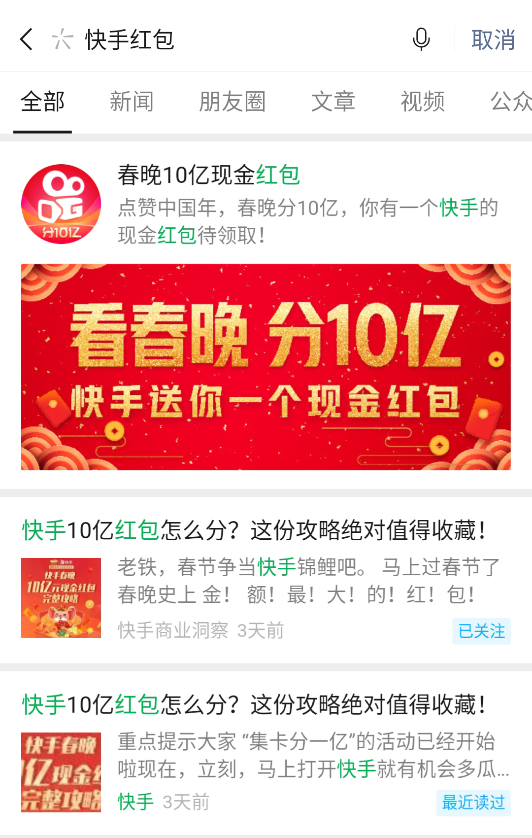 速途網了解到,這項頗為神秘的活動是快手聯合微信發出的“快閃”紅包,僅限除夕當天。快手已經在春晚10億元現金之外,特別為微信用戶準備了金額可觀的現金紅包。用戶只需在24日早8點打開微信“發現”,進入“搜一搜”輸入“快手紅包”,即可參與活動。不僅如此,用戶在春晚直播期間,也可以在微信搜索“春晚直播”,進入“快手短視頻”小程序,在線觀看春節聯歡晚會。
