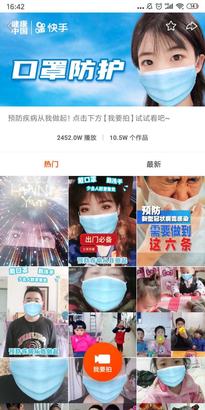 除了內(nèi)容運(yùn)營(yíng),快手方面還發(fā)起了端內(nèi)運(yùn)營(yíng)活動(dòng)。與衛(wèi)健委聯(lián)合發(fā)起#一起戴口罩#打卡活動(dòng),號(hào)召全民注重健康安全,鼓勵(lì)公眾每天戴口罩,共同營(yíng)造一個(gè)對(duì)自己、對(duì)社會(huì)負(fù)責(zé)的公共氛圍。