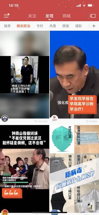 打開(kāi)快手“發(fā)現(xiàn)“頁(yè),最顯眼的是,“推薦”欄右側(cè)新增“肺炎防治”頻道,針對(duì)疫區(qū)重點(diǎn)全量投放。在該頻道中,疫情相關(guān)內(nèi)容實(shí)時(shí)聚合,內(nèi)容均來(lái)自入駐的權(quán)威媒體和國(guó)家機(jī)關(guān)。記者瀏覽后發(fā)現(xiàn),內(nèi)容豐富、及時(shí)、權(quán)威,主要有以下幾類(lèi):疫情動(dòng)態(tài)信息、疫情防治常識(shí)及科普,疫情事件下醫(yī)護(hù)人員和患者的感人故事。記者獨(dú)家獲悉,該頻道自昨日下午上線(xiàn)以來(lái),曝光滲透率持續(xù)提升,“說(shuō)明用戶(hù)都非常關(guān)注。“