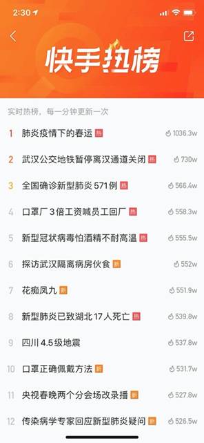 打開(kāi)快手搜索框,可以看到快手熱榜。23日下午2時(shí)許,速途網(wǎng)打開(kāi)榜單,發(fā)現(xiàn)前12條有10條與疫情相關(guān)。點(diǎn)擊對(duì)應(yīng)詞條后,可以看到對(duì)應(yīng)相關(guān)視頻。快手熱榜運(yùn)營(yíng)人員稱(chēng),3天來(lái),快手熱榜持續(xù)動(dòng)態(tài)關(guān)注疫情事件,根據(jù)用戶(hù)需求和內(nèi)容熱度,聚合上線(xiàn)了50余條熱詞。其中,熱度最高的熱詞有“武漢加油”、“ 女醫(yī)生寫(xiě)家書(shū)請(qǐng)戰(zhàn)新型肺炎”、“ ECMO技術(shù)成功救治一患者”、“ 首例重癥新型肺炎患者發(fā)聲”等內(nèi)容。
