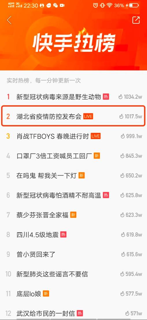 除了短視頻,對(duì)于媒體的直播,快手熱榜也積極進(jìn)行了資源配置。22日晚10時(shí)許,人民日?qǐng)?bào)、新華社、央視新聞,同步直播了湖北省疫情防控發(fā)布會(huì),快手熱榜在榜二位置,進(jìn)行高位推薦。