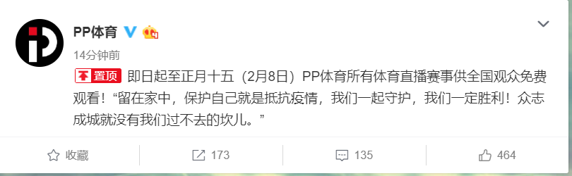PP體育:即日起至2月8日,所有體育直播賽事免費觀看 李楠 ? 2020年1月24日 23:00 ? 體育, 快訊 速途網訊 剛剛,PP體育發布微博稱,即日起至正月十五(2月8日)PP體育所有體育直播賽事供全國觀眾免費觀看!“留在家中,保護自己就是抵抗疫情,我們一起守護,我們一定勝利!眾志成城就沒有我們過不去的坎兒。” ???? (李楠) 贊 (0) 李楠 0 生成海報 超6億人參與,全民掃福超400億人次,集五福入選21世紀“新四大年俗” 上一篇 2020年1月24日 22:27 快手春晚互動量破紀錄:截止23點累計已達437次 下一篇 2020年1月24日 23:25