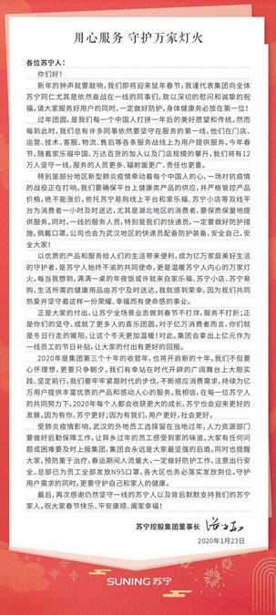 眾志成城,共克時艱。“正是大家的堅守,成全了更多人的平安團圓”,蘇寧控股集團董事長張近東年前發表致蘇寧一線員工的春節慰問信時表示對此,蘇寧將為一線員工提供上億元的節日補貼,回報員工付出。