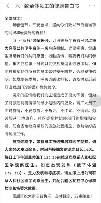 由于目前疫情防控正處于關鍵期,1月26日,蘇寧在發給員工的《健康告白書》里,再次呼吁員工做好安全防護,合理安排假期,服從當地政府、社區、疾控防疫部門的安排,如發現有發熱、呼吸道感染癥狀,及時就近到開設發熱門診的醫療機構就診。
