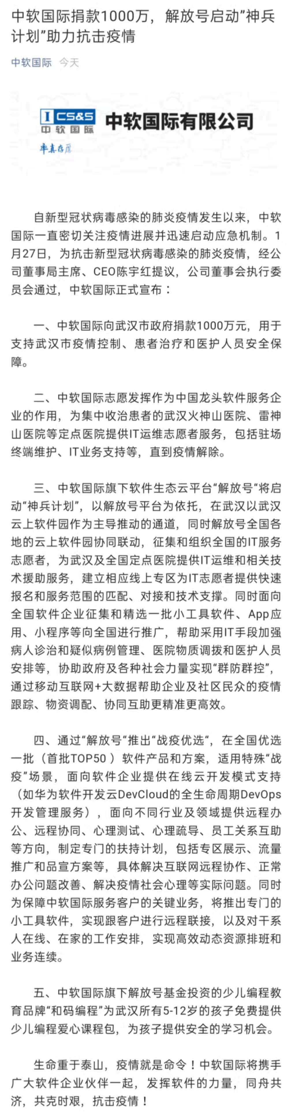 速途網訊 今日,為抗擊新型冠狀病毒感染的肺炎疫情,中軟國際宣布向武漢市政府捐款1000萬元,用于支持武漢市疫情控制、患者治療和醫護人員安全保障。同時為集中收治患者的武漢火神山醫院、雷神山醫院等定點醫院提供IT運維志愿者服務,包括駐場終端維護、IT業務支持等,直到疫情解除。此外,中軟國際旗下軟件生態云平臺“解放號“將啟動“神兵計劃” ,為武漢及全國定點醫院提供IT運維和相關技術援助服務,建立相應線上專區為IT志愿者提供快速報名和服務范圍的匹配、對接和技術支撐。 (李楠)