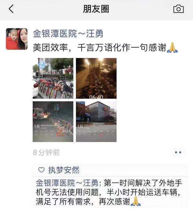1月29日,汪女士在微信朋友圈“隔空喊話”,希望共享單車企業(yè)能緊急支援,在相關(guān)區(qū)域加大投放,以解決醫(yī)護(hù)人員通勤問題。美團(tuán)單車運營團(tuán)隊了解到這個信息后,在半小時內(nèi)緊急調(diào)配300輛單車馳援前線,保障了金銀潭醫(yī)護(hù)、防疫人員免費出行。