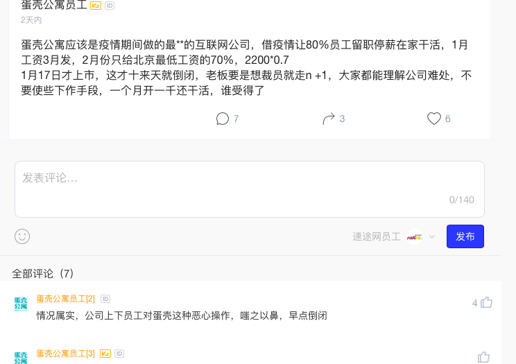 在脈脈上,認證為蛋殼公寓員工的發布者從1月29日時便接連表示,蛋殼公寓拖欠工資,同時借疫情變相裁員。