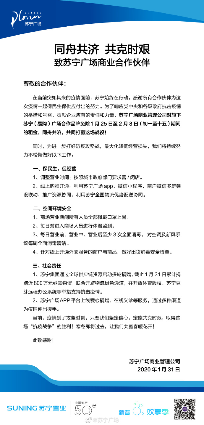 蘇寧廣場免除合作品牌初一至十五期間的租金 仙雯 ? 2020年2月1日 12:59 ? 快訊, 零售 速途網訊 昨日,蘇寧廣場發布微博稱,蘇寧廣場商業管理公司對旗下蘇寧(易購)廣場合作品牌免除1月25日至2月8日(初一至十五)期間的租金,同舟共濟,共同打贏這場戰役。 蘇寧廣場蘇寧易購 贊 (0) 仙雯 0 生成海報 滴滴出行:武漢等湖北16城網約車司機車租順延1個月,與行業伙伴共同推動全國范圍內的車租延租方案 上一篇 2020年2月1日 12:56 快手200場戰“疫”大直播,累計觀看超10億人次 下一篇 2020年2月1日 13:05